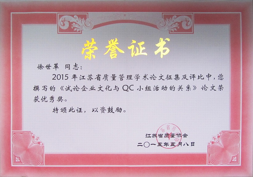 由江蘇省質量協會舉辦的2014年江蘇質量管理學術論文征集評選活動落下帷幕,5月8日在南京華江賓館召開了江蘇質量管理學術論文表彰暨交流會,江蘇省質量技術監督局副局長張前、質量處處長兼省質量協會副秘書長祁寧清、省質量協會會長耿寧等及獲獎作者參加了會議。集團公司徐世革同志的《試論企業文化與QC小組活動的關系》榮獲優秀獎。