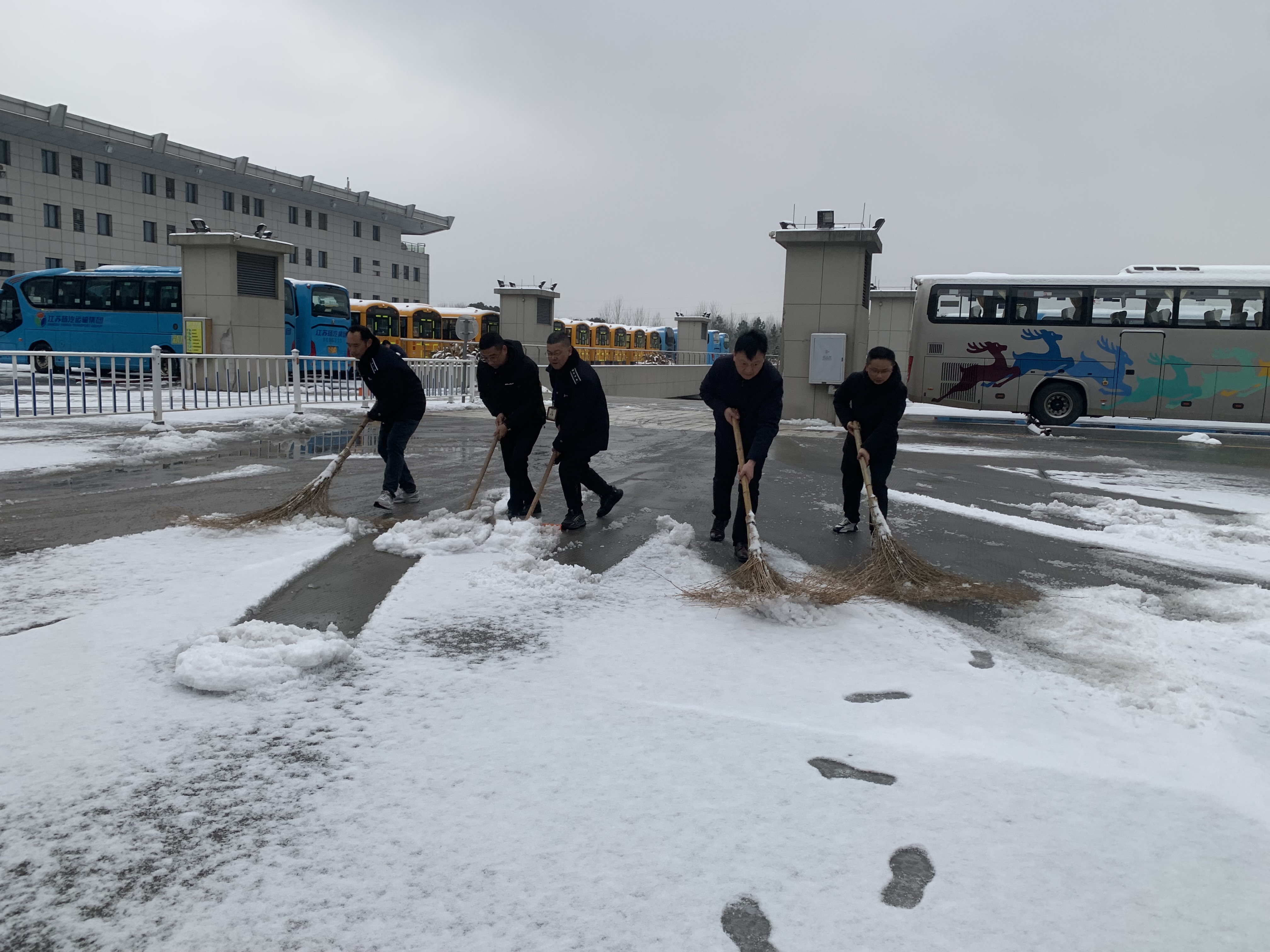 在揚州汽車站,集團平安志愿者分會聯合團委,組織青年職工志愿者前往車站,在站前廣場、發車平臺、進出站口等重點部位清理積雪、撒布融雪劑和鋪設防滑草墊,大家相互配合、齊心協力、干勁十足,全面開展除雪鏟冰工作,為廣大旅客安全、便捷出行做好后勤保障。